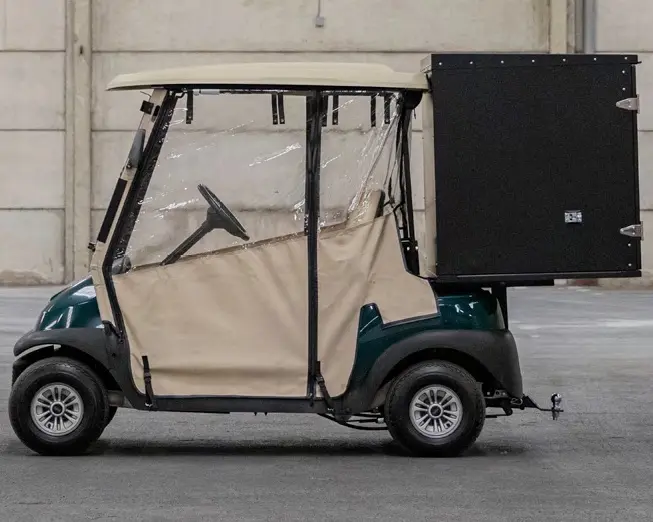 Tweezitter met dichte laadbak en hoes48 VoltElektrisch (3,3 Pk Motor)2 PersonenKunststof met opbouw (Zeilhuif + Dichte box)48V (Loodzuur, Onderhoudsvrij of Lithium)Grasbanden (18x8.50-8 4PLY)