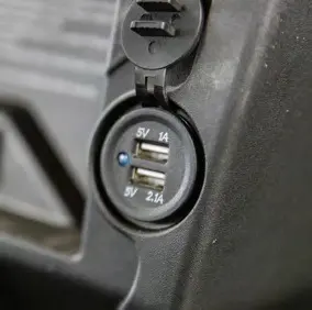 Gemak dient de mens. In het dashboard vindt u dubbele USB-aansluitingen (5V 1A en 5V 2.1A). Ideaal om uw telefoon of tablet op te laden tijdens een ronde op de golfbaan of inspectie op het terrein.